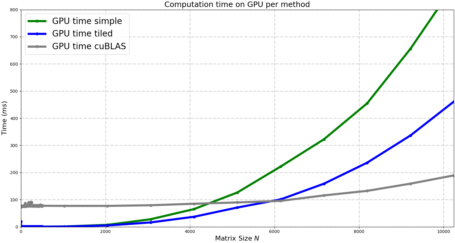 This last graph shows us that as expected it is better to use the library cuBLAS to multiply any two matrices on the GPU. However, the call for these functions has a cost, you cannot implement something custom i.e. a matrix multiplication and another custom optimization operation using a self programmed kernel. The moment you want to fuse operations in kernels you would probably need to implement your own multiplication with other operations inside the same CUDA kernel.