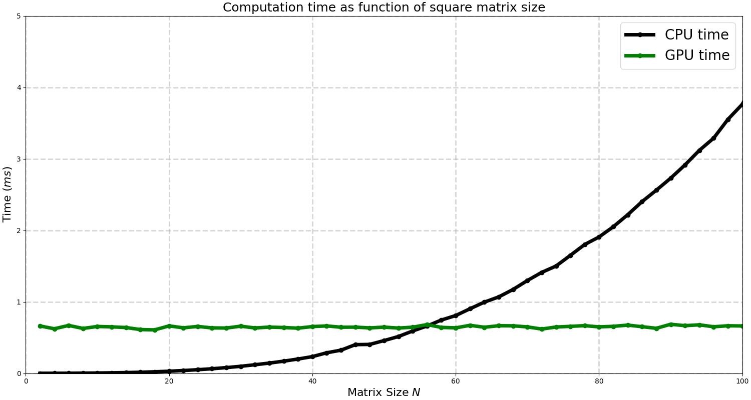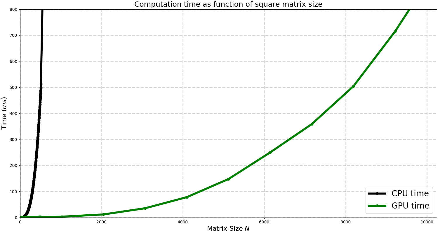 It can be seen that CPU time goes out of the scale whilst GPU slowly increases. For $N \approx 10K$ elements the multiplication time is around 0.85 seconds for the GPU.